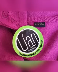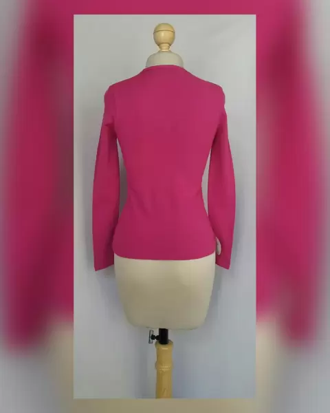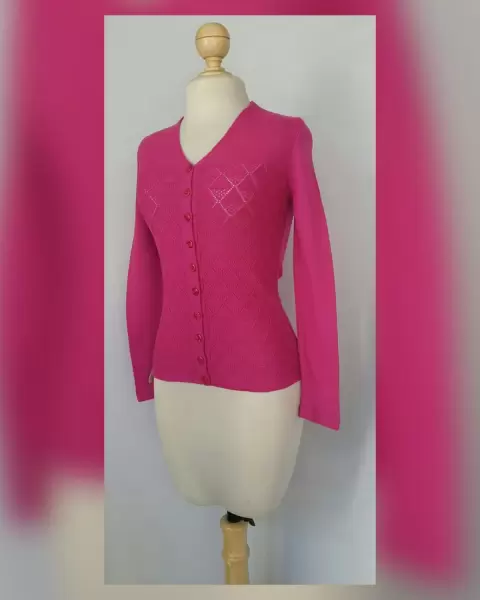 Suéter básico en tejido de punto c/estructura tono BUGAMBILIA, cuello V, cierre p/botonadura. Unitalla (da a S/M). Dimensiones cms: 36 hombro, 40 axila, 42 zona baja, 56 largo, 64 largo manga. 100% acrìlico. Para lavado en casa.