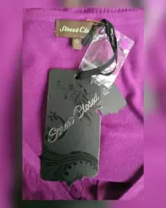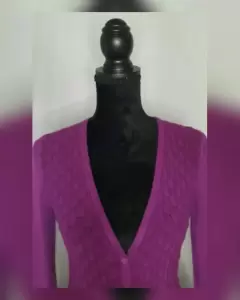 Suéter básico en tejido de punto c/estructura color UVA, cuello V, cierre p/botonadura y manga larga terminada en puño. Talla G (REDUCIDA, da mejor a M). Dimensiones cms: 36 hombro, 41 axila, 37 cintura, 40 zona baja, 48 largo, 63 largo manga. 85% viscosa, 20% elastano, 15% poliéster. Para lavado en seco.