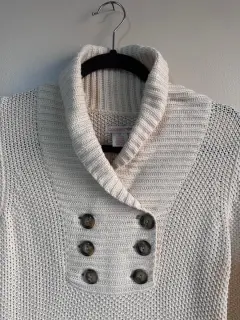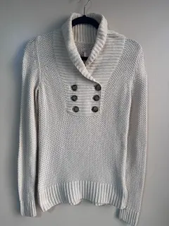 Suéter color beige de puntoTalla XS, pero da a una sEstira un pocoBotones al frenteDe uso en buen estado Medidas aprox: ax-ax 40cm, largo 60cm100% algodon