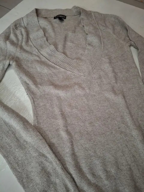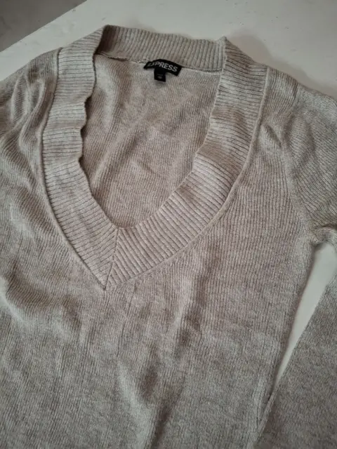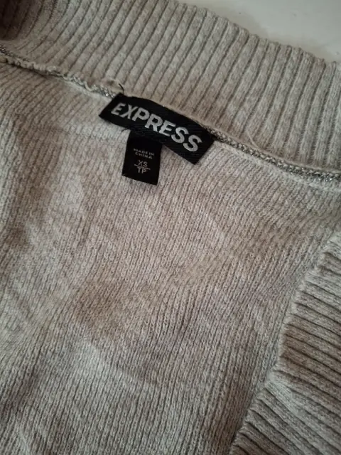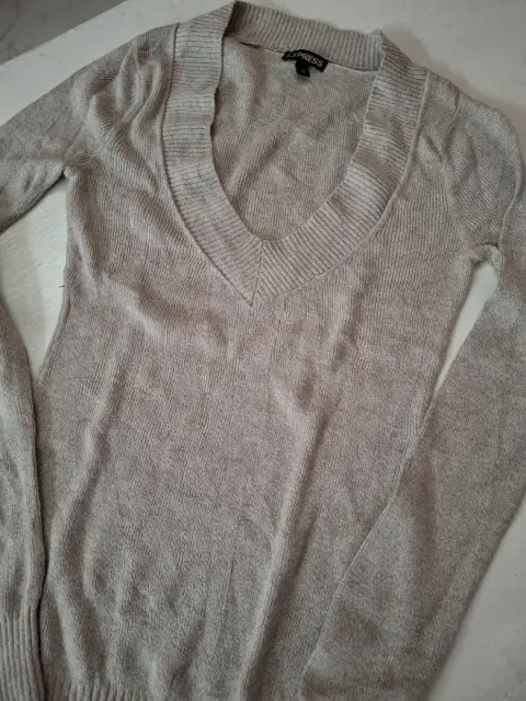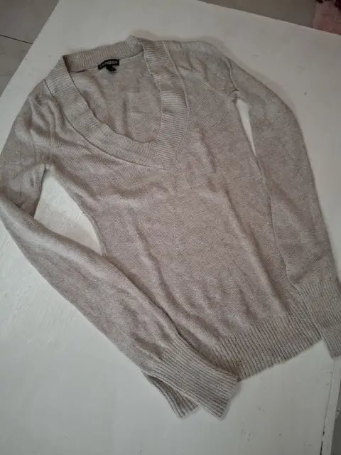 Suéter Beige Express. Suéter beige talla Xs corte ajustado, cuello V, tela delgada y suave