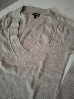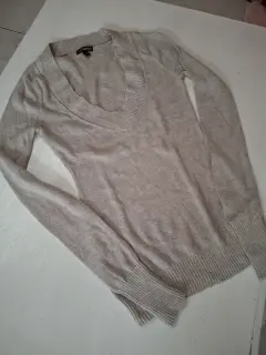Suéter beige talla Xs corte ajustado, cuello V, tela delgada y suave