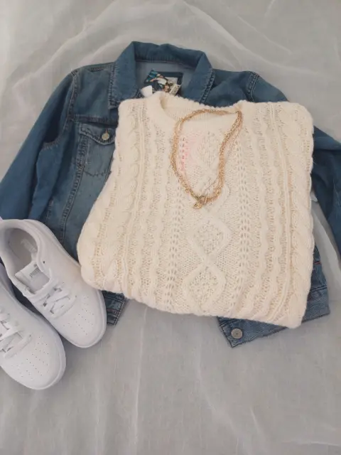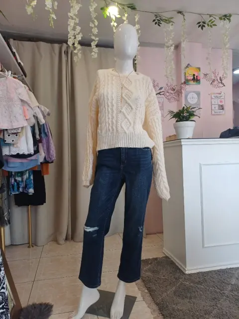 🌸Hermoso suéter tejido de color huesito. Es grueso y holgadito. Muy bonito 🌸🪻Sus medidas son ax a ax 63 CM, largo 51 cm.