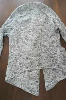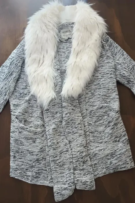 Sueter bicolor. Suéter largo y abierto, negro con blanco, con cuello de peluche desmontable y bolsillos a los lados