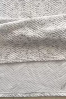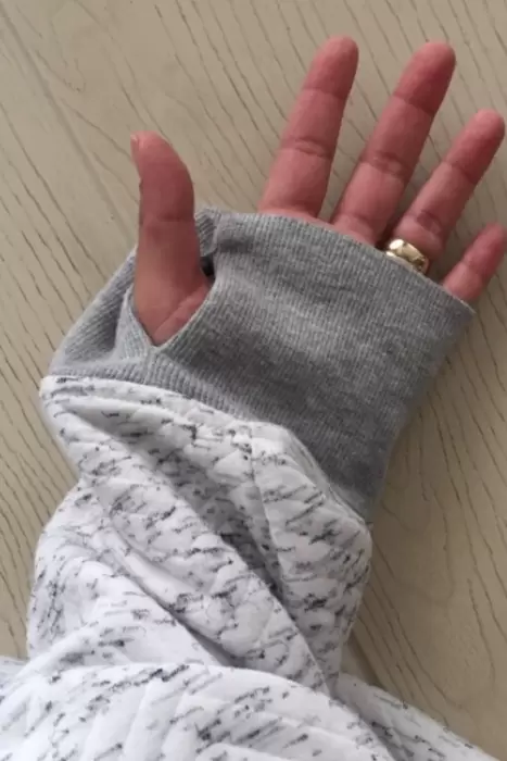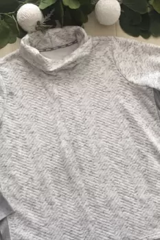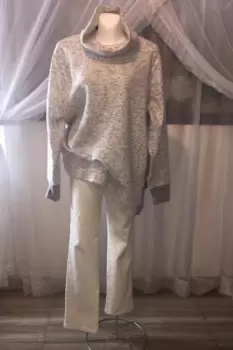 Suéter blanco tipo sudadera cuello ruso con detalle de resorte en las mangas con agujero para dedo, viene con aberturas laterales, la tela viene con decorado de hilos negros sueltos