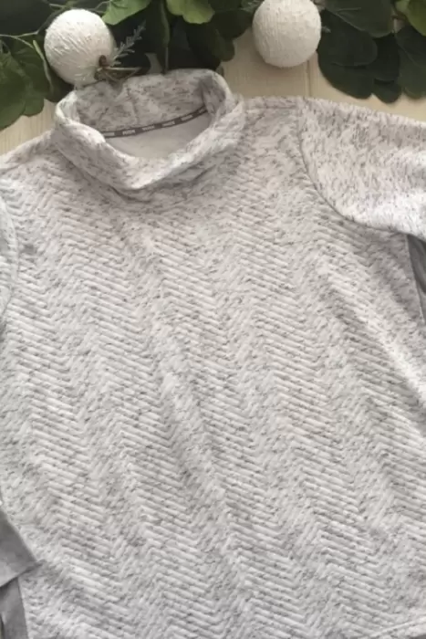 Sueter blanco. Suéter blanco tipo sudadera cuello ruso con detalle de resorte en las mangas con agujero para dedo, viene con aberturas laterales, la tela viene con decorado de hilos negros sueltos