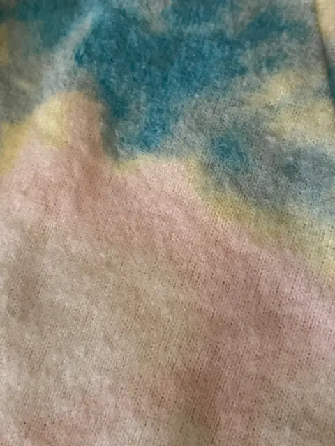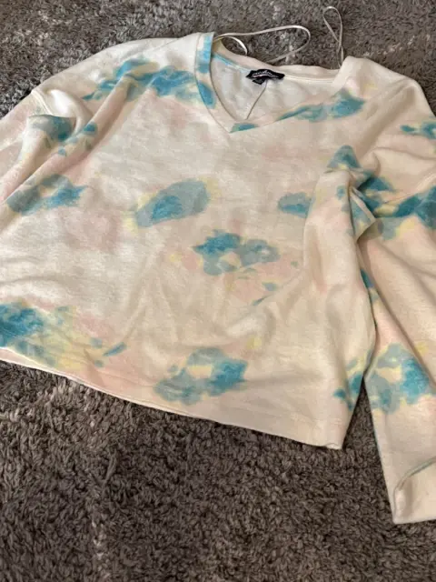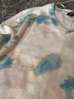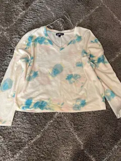 Hermoso suéter blanco con estampado de manchitas azules. Es súper ligerito pero también muy calientito. De hombros caídos. Medidas ax a ax 60 cm, largo 57 cm.