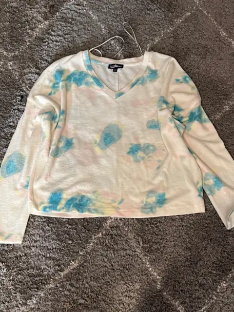 Suéter blanco con estampado. Hermoso suéter blanco con estampado de manchitas azules. Es súper ligerito pero también muy calientito. De hombros caídos. Medidas ax a ax 60 cm, largo 57 cm.
