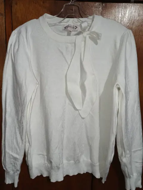 Suéter tejido en color blanco con pliegue en los hombros y detalle en las costuras de los brazos, con lazos en el cuello para crear un moño, de cuello redondo, de algodón