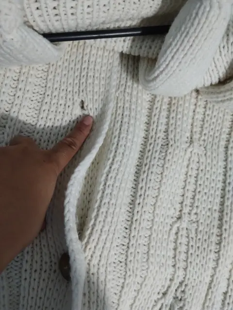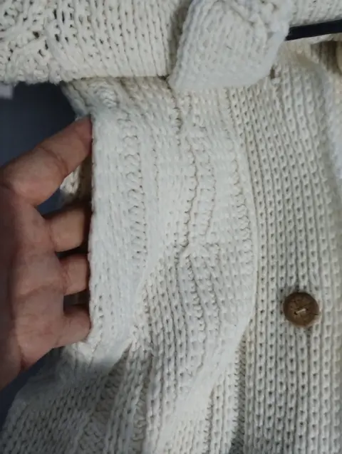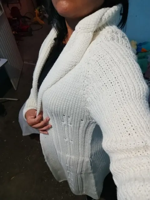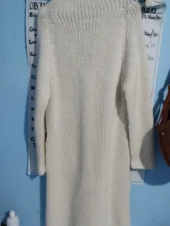 Suéter blanco tejido con bolsa parte frente. Es un artículo con uso pero en excelentes condiciones cuenta con bolsas parte frente llega hasta la rodilla muy cómodo y elegante el detalle falta un botón pero no afecta su uso muy calientito para esta temporada