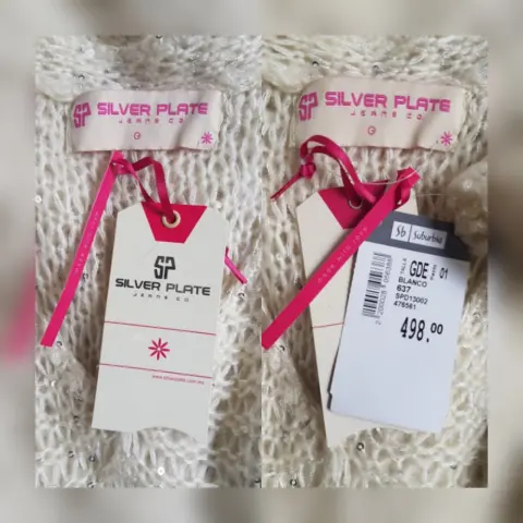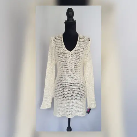 Suéter largo estilo blusón en tejido de punto c/estructura color MARFIL c/aplique lentejuela cosida tono PLATA, cuello V y manga larga. Talla G. Dimensiones cms: 40 hombro, 46 axila, 40 cintura, 54 zona baja, 74 largo, 66 largo manga. 61% acrílico, 39% poliéster. Para lavado en casa.***EL TONO EXACTO ESTÁ EN LA FOTO NÚM 5******EL DESTELLO QUE GENERA LA LENTEJUELA EN LA PRENDA ES MUY BELLO Y NO LO CAPTA LA FOTOGRAFÍA***