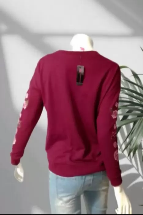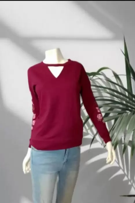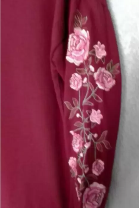 Sueter color vino, con bordado floral en mangas, pequeño escote en V Talla-S