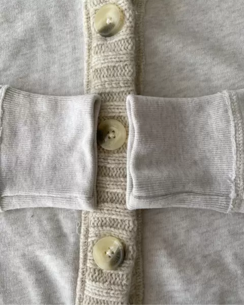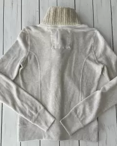 Suéter tela de sudadera con botones, cuello y dos bolsillos al frente.Talla: SMedidas: 44 cm de axila, 37 cm de hombros, 56 cm de largo.Sin detalles
