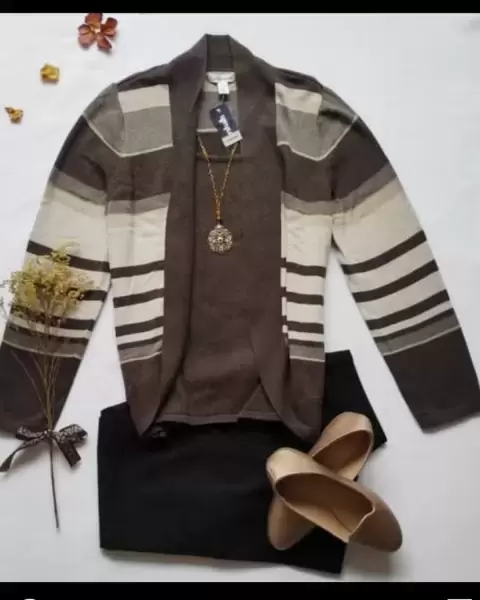 Bonito sueter abierto con blusa integrada color café capuchino su manga es 3/4Es talla PL que es Petite L, si eres entre talla M /G te va a quedar muy bienHombro 35cmSisa 21cmBusto 47cmLargo total 56cm