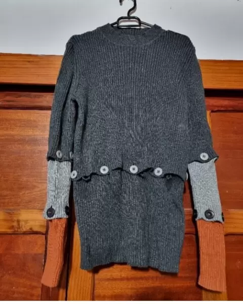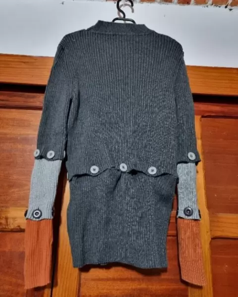 Sueter de punto convertibleCada capa de botones se puede quitarSe puede acortar hasta hacerse crop top y las mangas hasta 3/4Foto ilustrativaSin detallesQueda bien desde una talla s hasta una l