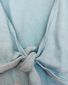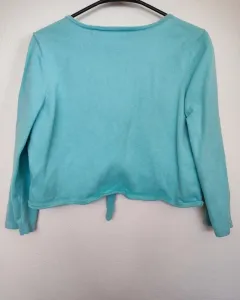 Suéter corto aqua. Descripción:Hermoso suéter tipo torero (corto) color verde agua, en la parte de adelante tiene tiras para justarlo al cuerpo o solo hacerle un nudito y usarlo cerrado o abierto.Talla G pero queda super cómodo a M también