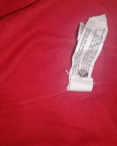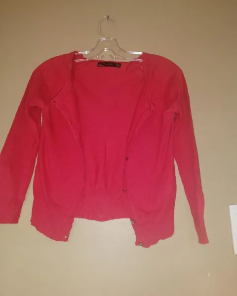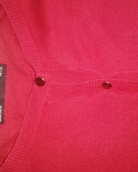 Sueter corto, a la altura de la cintura en color rojo, talla 26 o ch marca Zara. Tiene sus botones originales más uno extra. Color un poco desgastado u botón superior flojo.