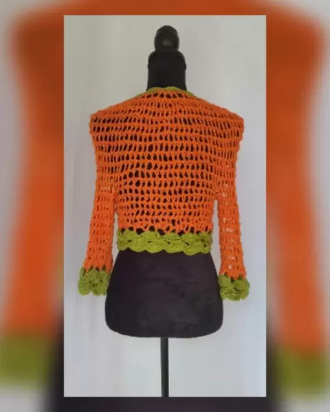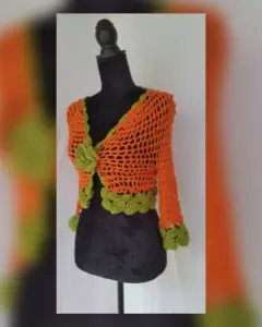 Suéter cropped en tejido de punto c/estructura bitono CALABAZA/VERDE SECO, cuello pico, manga 3/4 y cierre p/flor mismo tejido. UNITALLA (Da a S/M). Dimensiones cms: 35 hombro, 39 axila, 37 zona baja, 36 largo, 40 largo manga. 100% acrílico. Para lavado en casa.
