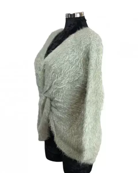 Suéter cruzado tipo angora. Lindo suéter en tela tipo angora con deshilado en color verde menta, fruncido al centro, súper fashion y a precio especial.