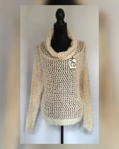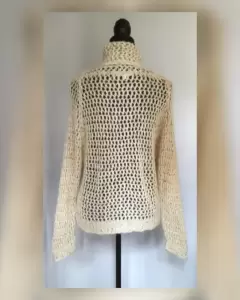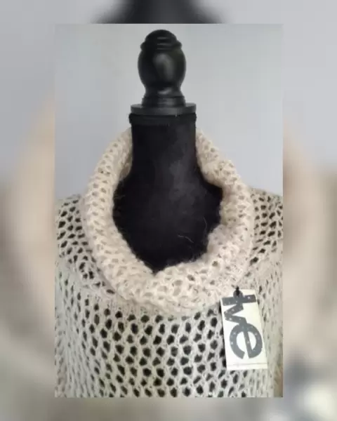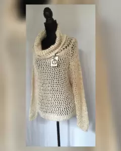 Suéter en tejido de punto canale en combinación Mohair color BEIGE AVENA, cuello ruffle y mangas terminadas en puño. Talla M (da a M/L). Dimensiones cms: 50 hombro, 66 axila, 54 zona baja, 57 largo, 67 largo manga. 52% acrílico, 28% poliamida, 20% mohair. Para lavado en casa.***HECHO EN ITALIA***
