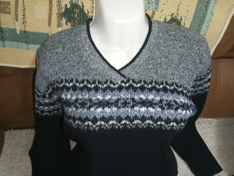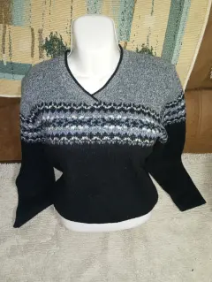 Suéter cuello V corto. Bonito suéter cuello V de punto, bastante calientito, con detalles tejidos en diferentes colores al centro, queda como tipo crop-top, manga larga , muy lindo para un outfit de otoño ❤️ marcado como talla M pero igual llega a talla L