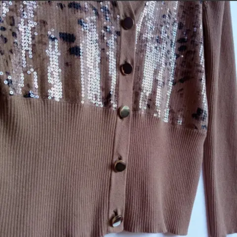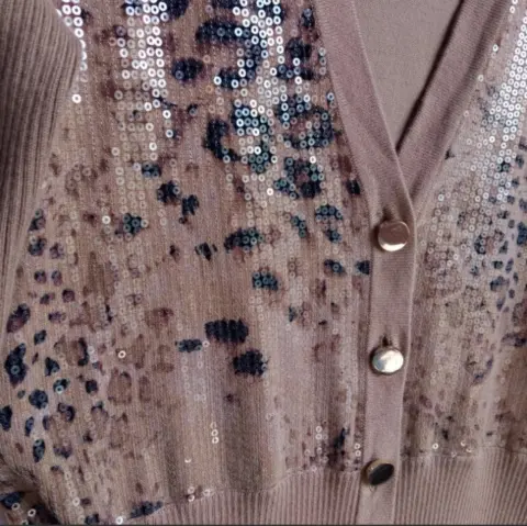 Suéter de botones y escote en V, CACHÉEstampado animal print con bordado en lentejuela.Talla SMedidas tomadas por un solo lado:*Hombros 35 cm*Axila-Axila 41 cm*Cintura 31 cm (estira)*Largo 52 cm⚜️ Por favor 🙏, si vas a ofertar, sea solo porque tú compra es segura ⚜️