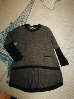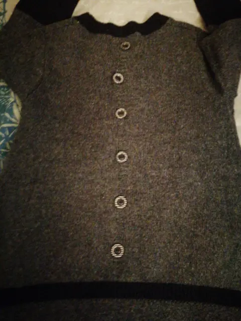 Suéter gris de lana con botones en la parte de atrás y bolsitas delanteras, puesto una vez