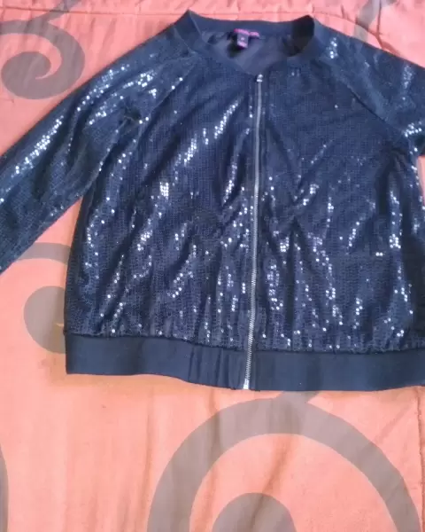 Suéter de lentejuelas color negro. Con cierre al frente.