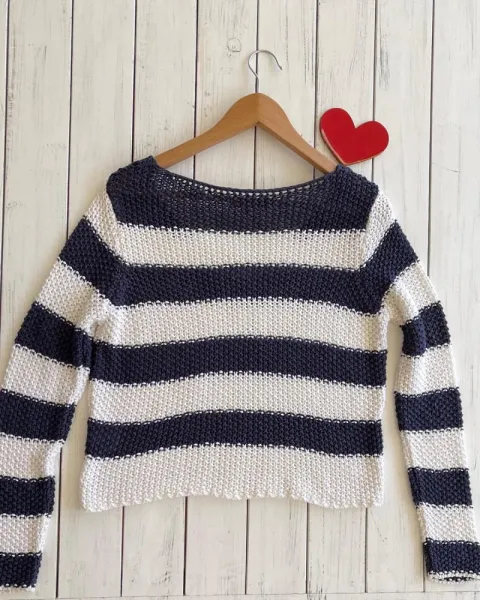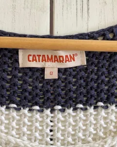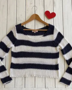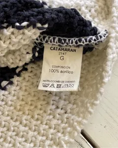 Suéter de punto grueso a rayas Catamarán. Talla: GrandeMedidas: 41 cm hombros, 49 cm axila y 47 cm largo. Medidas tomadas sin estirar.Suéter de punto abierto y grueso, escote redondo, es un suéter fresco a pesar de que sea grueso.