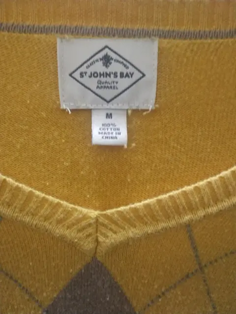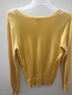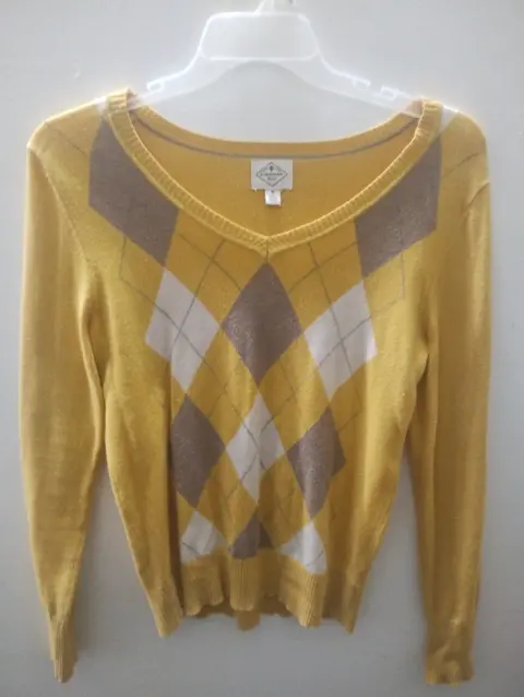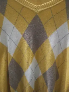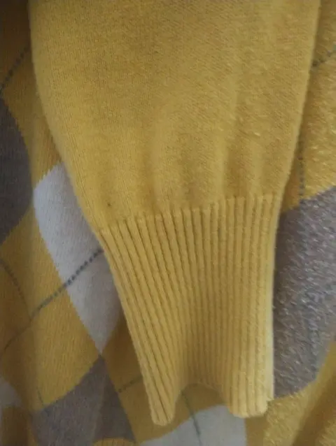 Suéter amarillo con estampado de rombos blancos y grises, en cuello v y mangas cómodas. Talla M 100% algodón