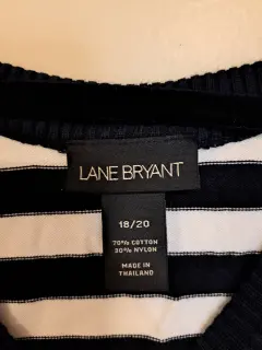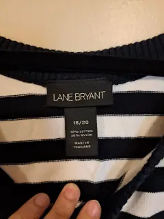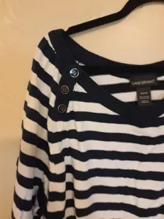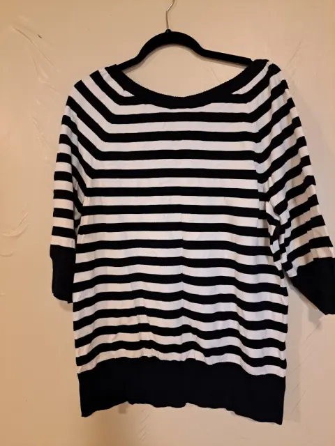 Suéter delgado Lane Brayant. Suéter de tejido ligero con manga tres cuartosCon líneas blancas y negrascon decoracion de botones a los ladosmarca Lane BryantTalla 18-20