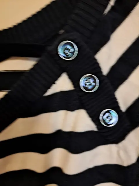 Suéter de tejido ligero con manga tres cuartosCon líneas blancas y negrascon decoracion de botones a los ladosmarca Lane BryantTalla 18-20