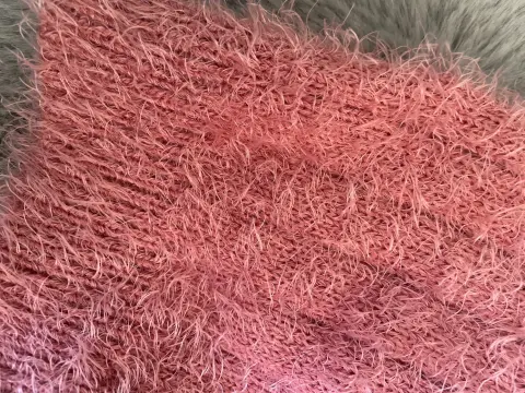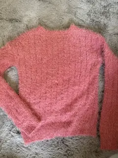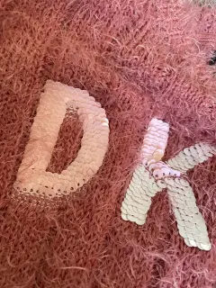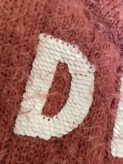 Suéter súper calientito y moderno, rosa, las letras son de lentejuela reversible rosa y blanco