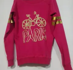 Vibrante color rosa fucsia, que le da un toque llamativo y femenino. En la parte delantera, tiene un dibujo de una bicicleta con un diseño vintage y encantador. Justo debajo de la bicicleta, se encuentra la palabra "Paris", que le agrega un toque francés y romántico. El suéter es cómodo y suave al tacto. ¡Seguro que te verás increíble luciendo este suéter único y con mucho estilo! 🌸🚲💕