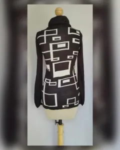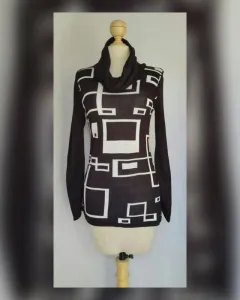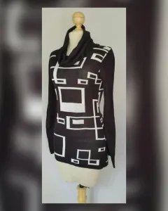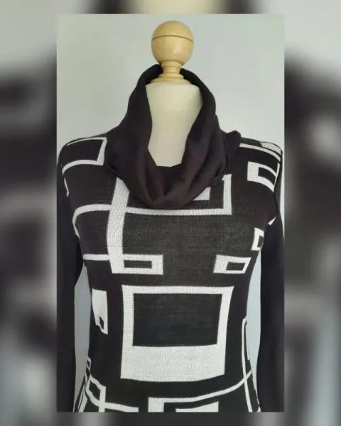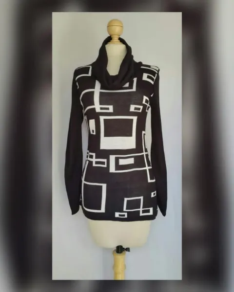 Suéter Grecas Cuello Ruffle. Suéter en tejido de punto color NEGRO ÉBANO c/diseño de grecas tono BLANCO POLAR, cuello ruffle y manga larga. UNITALLA (da a M/L). Dimensiones cms: 38 hombro, 43 axila, 39 cintura, 50 zona baja, 72 largo, 68 largo manga. 85% acrílico, 15% nylon. Para lavado en casa.