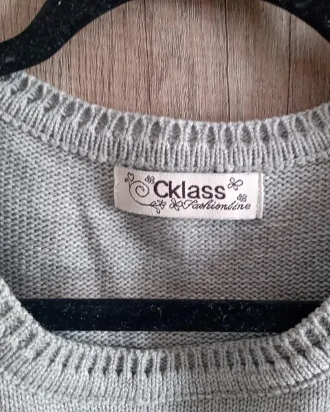 Hermoso sueter gris con letras.Pequeño detalle de costura en la foto 3 en el cuello, no afecta su uso.Talla L marca CklassFoto 4 sugerencia de uso