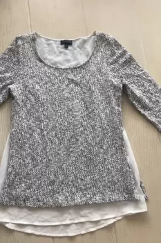 Sueter gris estilo blusa, la tela es muy delgatia, viene con simulacion de camisa abajo, a los costados tiene una abertura donde se aprecia mas la tela tipo camisa, marga 3/4, por la tela debajo no estira. Es talla extra chica pero le viene a una chicaMedidas:Hombro a hombro: 37 cmAxila a axila: 44 cmLargo: 60cm sueter /67 cm efecto camisa