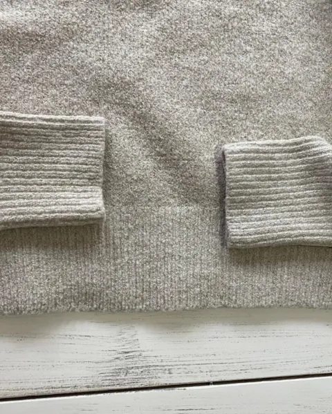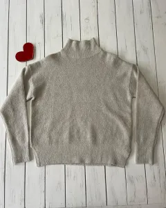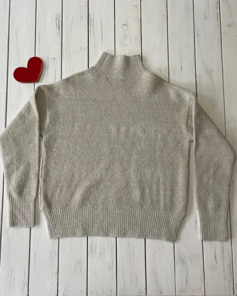 Talla: XSSuéter de punto color gris claro jaspeado o avena. Es grueso y muy calientito. Trae aberturas a los lados. Queda flojo. Para mi gusto podría quedar a una talla S Medidas: 52.5 cm de axila y 62 cm de largo.