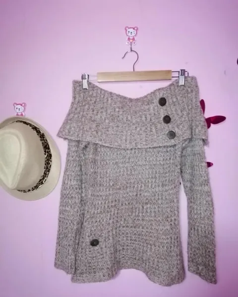 Suéter hombros descubiertos. Sueter de punto y hombros descubiertos, decoración de botones de madera, es de un color beige o café muy clarito, dice talla L, pero viene reducido le va bien a Una ch o M