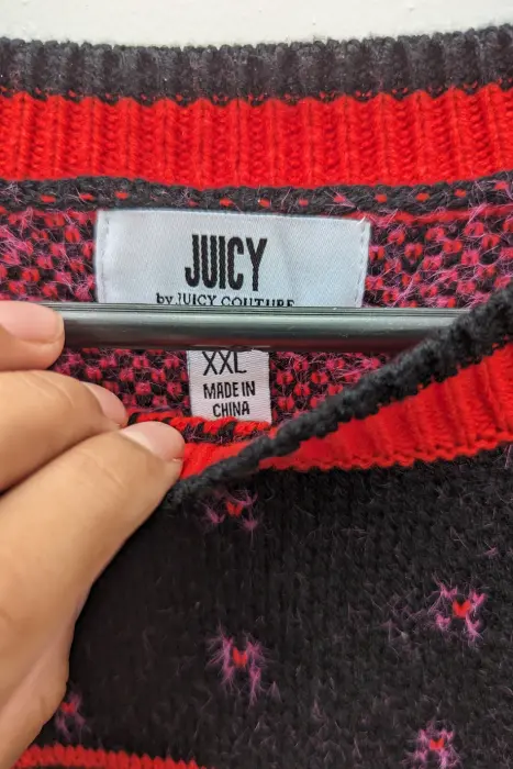 Suéter invierno negro con rojo. El suéter Juicy Couture en negro con detalles rojos es una verdadera declaración de estilo. La inclusión de la icónica palabra 'Juicy' en el diseño le da un toque distintivo y audaz. Su manga larga y cuello redondo lo hacen perfecto para mantenerse abrigado y cómodo en cualquier ocasión.