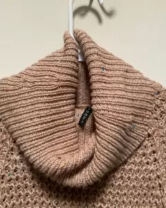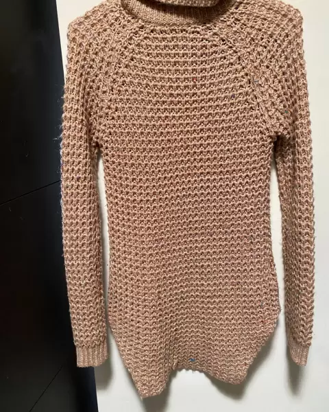 Suéter tejido largo ( llega arriba de la rodilla, dependiendo tú altura) mangas largas tejido de color café claro y con pelusas de colores (no son manchas) en excelente estado. Se ajusta, puede quedar a M