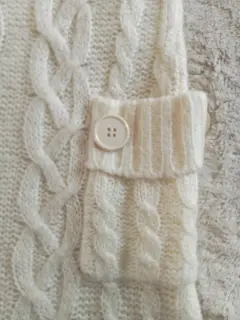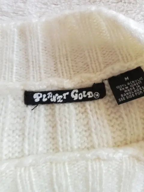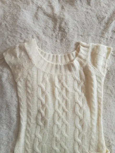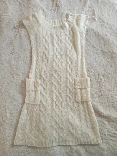 Suéter beige largo a la altura de rodilla, tejido, con dos bolsas frontales. 100 acrílico.Talla S. De marca no reconocida.