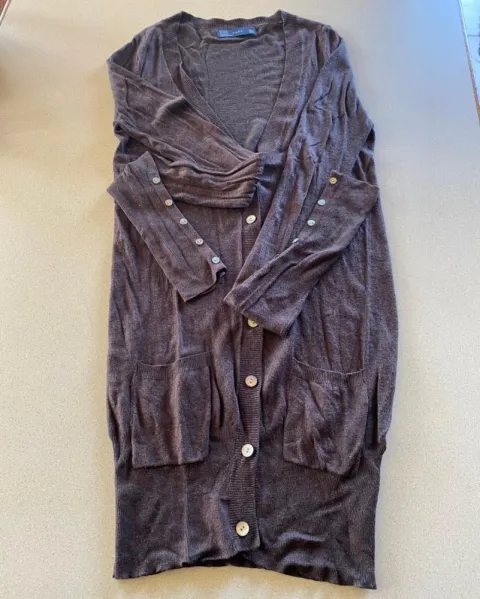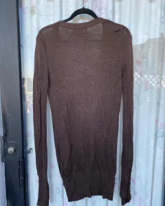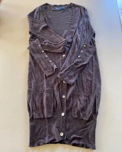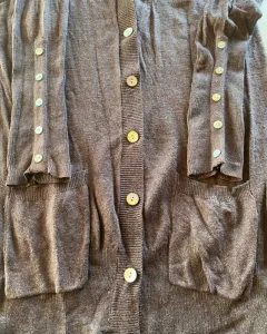 Suéter largo color café. Suéter ligero y muy cómodo al llevar, con dos bolsas al frente, botonadura en puños y frente en imitación nácar. Sin detalles…