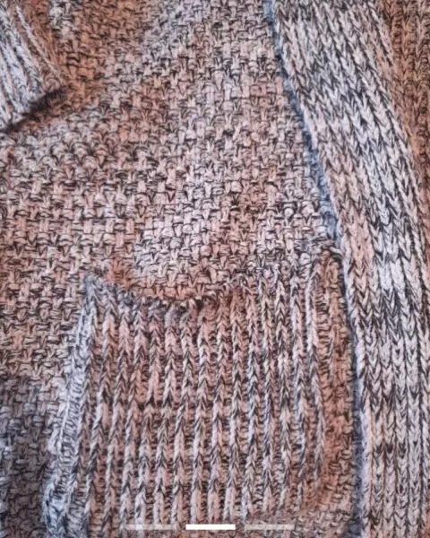 Suéter largo como tejido. Sueter gris, llega arriba de la rodilla, no tiene ningun detalle, el sueter no lleva botones y es muy calientito, es color gris con negro y es como tejido