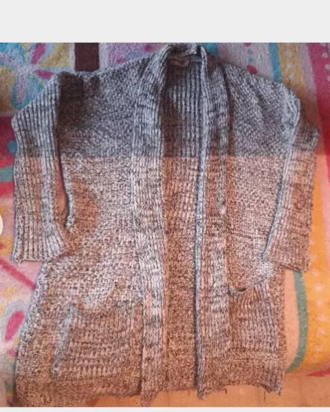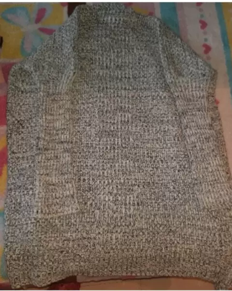Sueter gris, llega arriba de la rodilla, no tiene ningun detalle, el sueter no lleva botones y es muy calientito, es color gris con negro y es como tejido