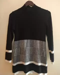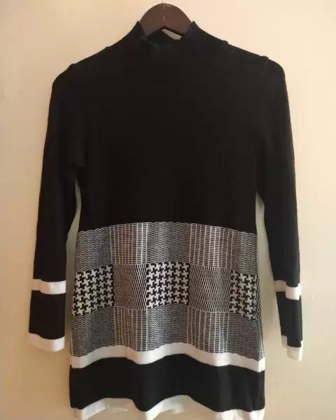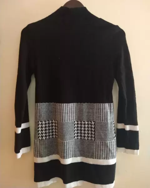 Suéter largo y de manga igualmente larga, talla XS-S aprox, en blanco y negro, adjunto foto de la textura de la tela, la cual es delgada y es algo elástica. Los colores intactos y sin ningún detalle.