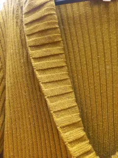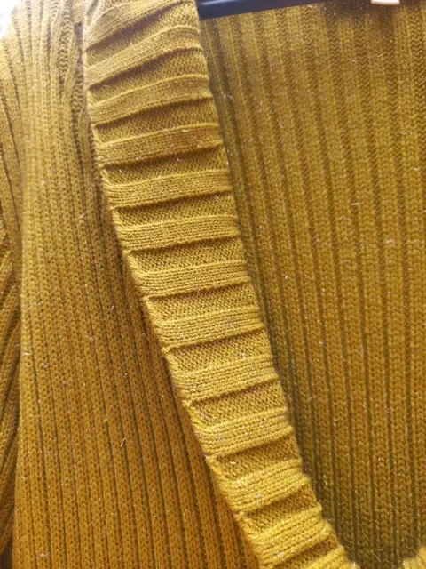 Talla Ch. Es de cardigan color verde caqui con hilos plateados con un sólo botón al frente, manga larga. En la parte derecha abajo tiene un hilo jalado. No está roto, sólo se jaló como se puede ver en la última foto.