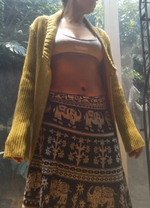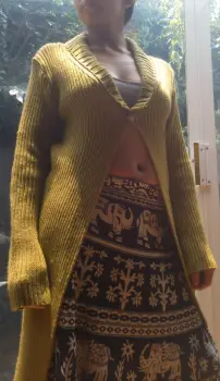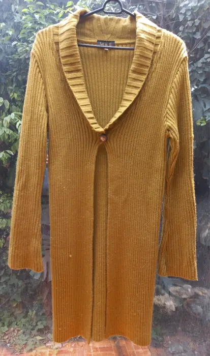 Suéter largo ligero. Talla Ch. Es de cardigan color verde caqui con hilos plateados con un sólo botón al frente, manga larga. En la parte derecha abajo tiene un hilo jalado. No está roto, sólo se jaló como se puede ver en la última foto.