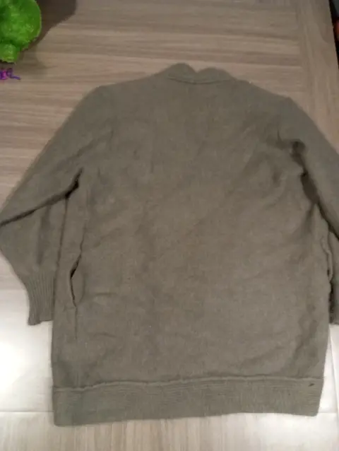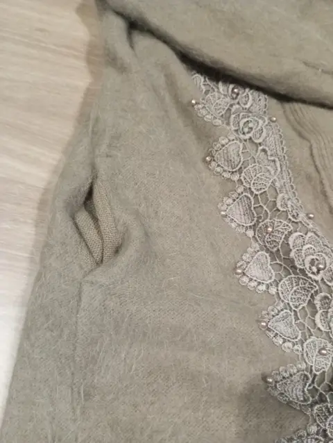 Suéter largo peludo, color café claro con apliques de imitación de perlitas y encaje, cuenta con bolsillos ocultos, hombreras y forro. La etiqueta dice unitalla, pero que a una talla L. Mide 45 cm de hombro a hombro, 58 cm de largo de la manga y 76 cm de largo del hombro hacia abajo. Marca Tae hyun