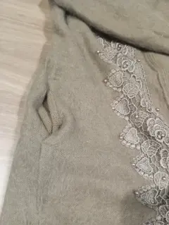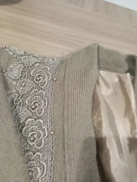 Suéter largo peludo. Suéter largo peludo, color café claro con apliques de imitación de perlitas y encaje, cuenta con bolsillos ocultos, hombreras y forro. La etiqueta dice unitalla, pero que a una talla L. Mide 45 cm de hombro a hombro, 58 cm de largo de la manga y 76 cm de largo del hombro hacia abajo. Marca Tae hyun