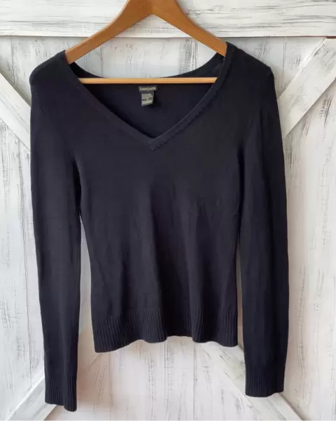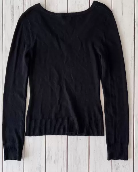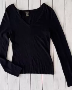 Suéter negro ligero y muy suave, cuello en v, manga larga, súper stretch (80% viscosa y 20% spandex). Talla: SMedidas: 35.5 cm hombros, 35 cm axila y 52 cm largo.
